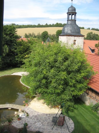 Neben der Terrasse befindet sich unter dem Baum ein Sandstrand mit flachem Zugang zum Teich für Kinder.