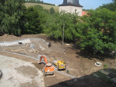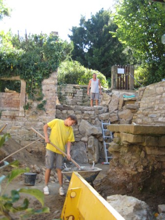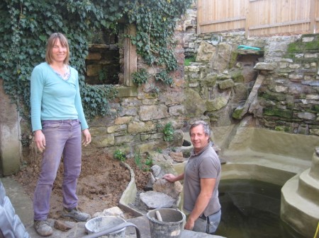 Frau Benna und Herr Webb beim gestalten eines Schwimmteichrandes.