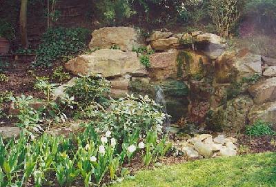 Wasserspiel mit Natursteinmauer und Bepflanzung