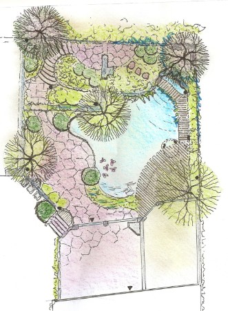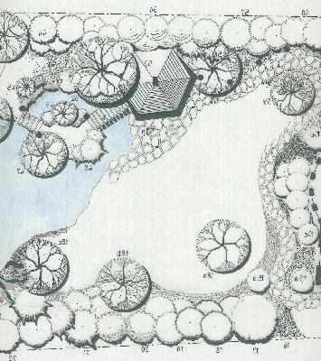 Ausschnitt eines Planes für ein Wassergarten mit Insel, Brücken und Sommerhaus. Von der Planung über die Ausführung gesamter Tätigkeiten (Natursteinarbeiten und Bepflanzung) sowie Pflege haben wir erfolgreich nach Kundenwunsch umgesetzt.