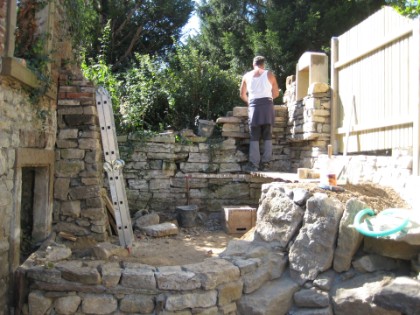 Errichten eines Sichtschutzes mit Naturstein und Zaun. Darunter wird ein kleiner Teich entstehen. September 2012